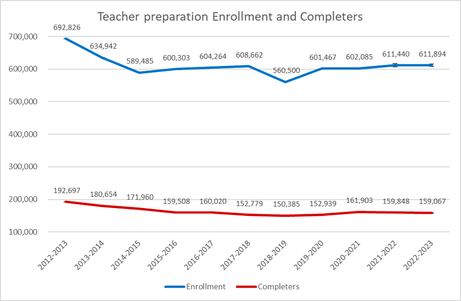 Based on data from the last few years, most states have more vacant positions and/or more underqualified teachers in the classroom than in previous years. This is year four of our work updating these data. For the 2025-2026 school year, we estimate there are at least 56,000 vacant positions and 350,000 underqualified positions. At the same time, we are seeing a stagnation in enrollment for teacher certification programs for most states.